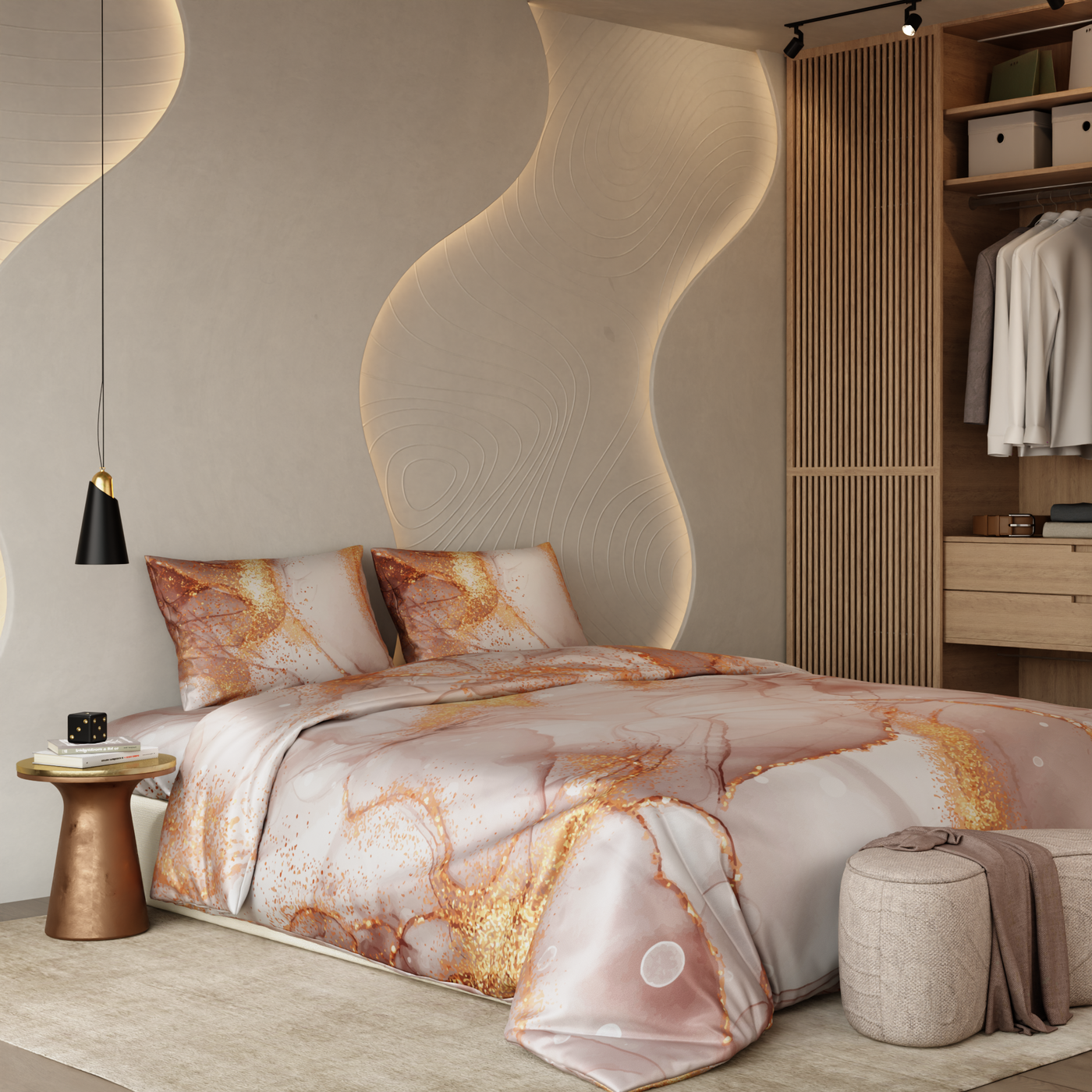 A delicate interplay of champagne hues and golden accents, Serenade in Champagne feels like a soft song at dusk. The warm blushes blend seamlessly with shimmering gold, creating a graceful, soothing symphony that envelops your senses in effortless elegance and comfort